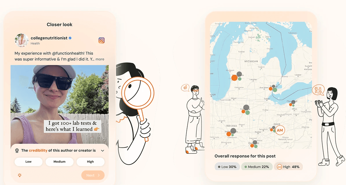 Unlike an AI app where humans ask questions that make the LLM better, on Twella, the AI probes the user's mind to pose questions that compel them to think, instead of just consuming media. The deep learning mode works at a higher level: 3 prompts to assess mindset, beliefs & topic knowledge, to raise awareness of your mental models. 3 prompts to evaluate credibility, evidence, & influence in a media post while cutting through noise. Lastly, we show a social map to see how others think across differences in age, gender, race to enrich our understanding.